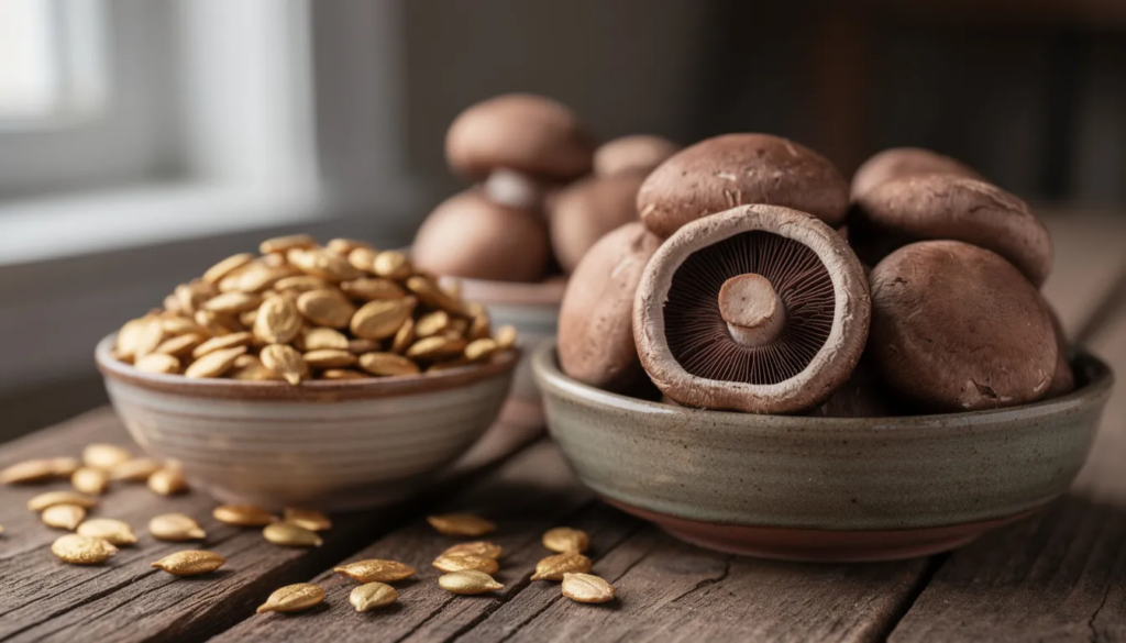 Crimini (brown) mushrooms: Contain approximately 3.3 mg niacin per cup (nearly 25% of daily value), naturally occurring NMN, ergothioneine and multiple b vitamins; population studies have linked regular mushroom consumption to reduced mortality rates through anti-inflammatory effects
